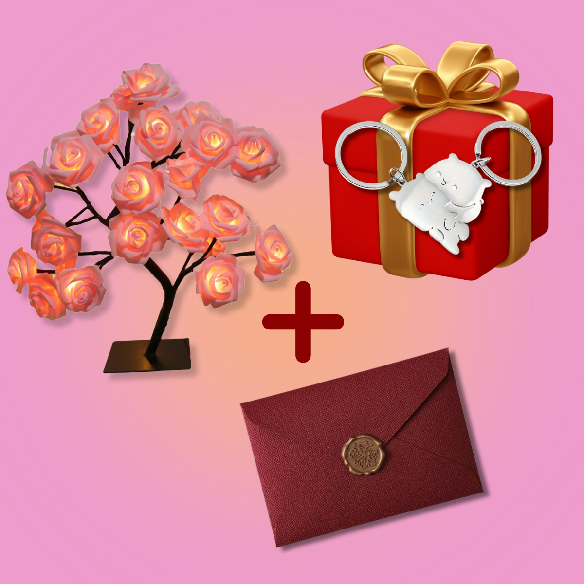 Включва Rose Tree Lamp, Love Envelope и Couple Keyholders – всичко, което прави подаръка пълен и специален. 🌸